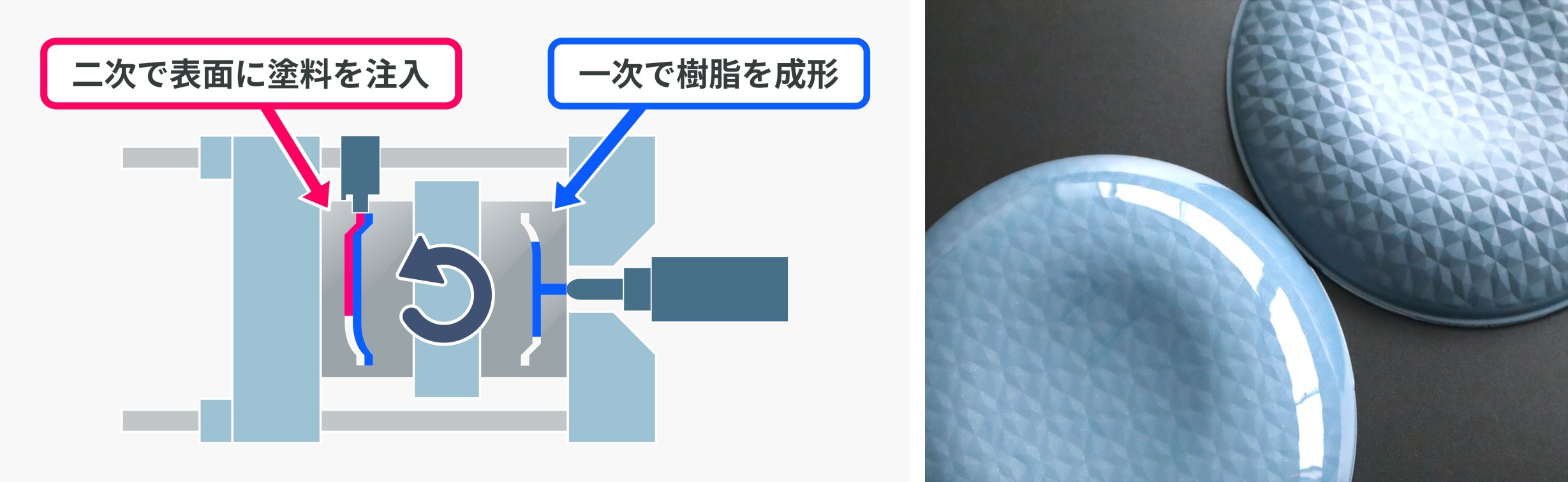 また、「メタルシール技術」により、金型を約2㎛(マイクロメートル)の高精度で密着させることで、低粘度塗料を確実に封じ込め、製品の表裏を均一に加飾する「全周加飾」を可能にしました。