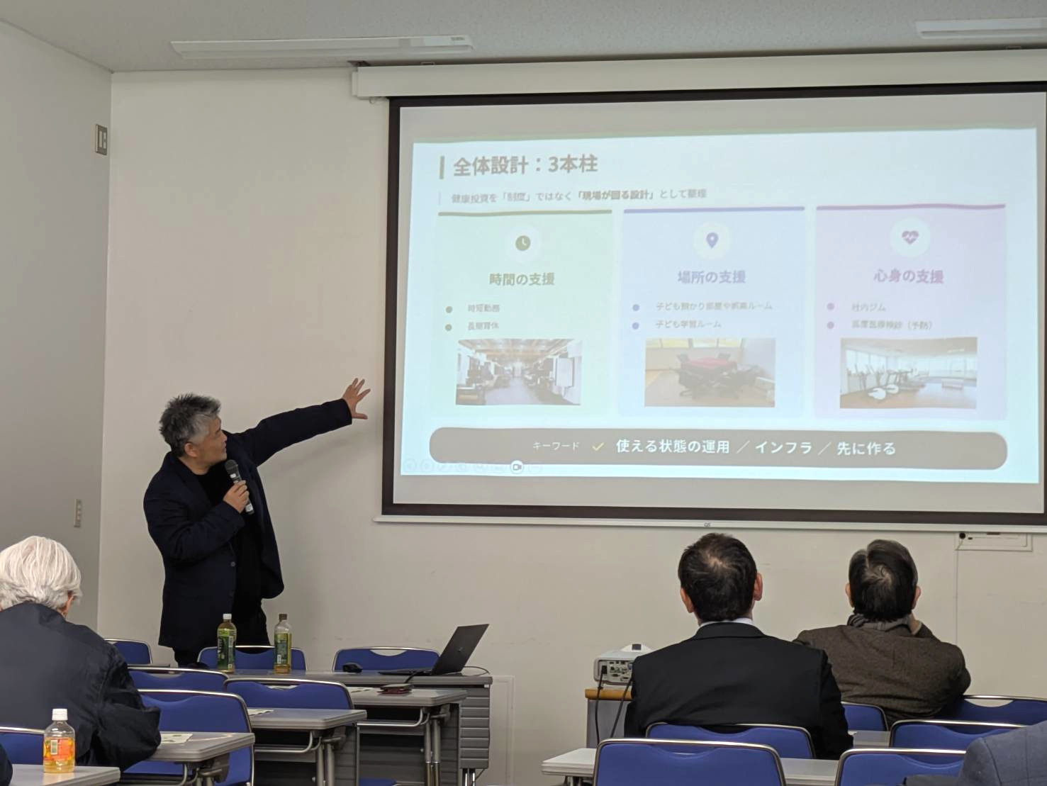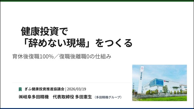 投稿日:2026.03.24 お知らせ ぎふ健康投資推進協議会 講演 2026年3月19日、ぎふ健康投資推進協議会からの依頼を受け、当社代表の多田憲生が講演を行いました。 本講演では「健康投資で”辞めない現場”をつくる」をテーマに、家庭と仕事を両立するための働きやすい職場づくりについて解説いたしました。 当日の講演資料は以下よりご覧いただけます。